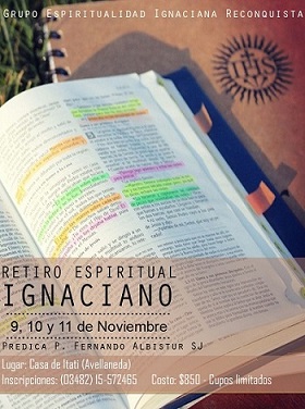 Se invita a los Ejercicios Espirituales de silencio y personalizados que se realizarán los días 09, 10 y 11 de noviembre. Serán predicados por un sacerdote Jesuita, P. Fernando Albistur SJ