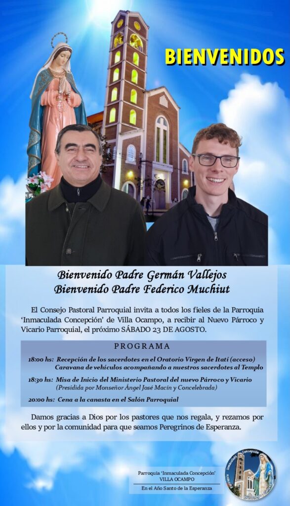 Comenzando por el día sábado 23 de agosto, el Pbro. Germán Ernesto Vallejos, asumirá como párroco de la parroquia «Inmaculada Concepción» de la ciudad de Villa Ocampo, quién será acompañado en esta nueva tarea pastoral por el Pbro. Federico Muchiut como Vicario Parroquial, oficio al cuál se lo instituirá en esta misma celebración.
