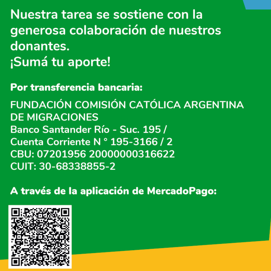 Nuestra tarea se sostiene con la generosa colaboración de nuestros donantes. Con tu aporte podes contribuir a que 5.000 personas migrantes, refugiados y solicitantes de asilo sean asistidos por la Comisión y las Delegaciones Pastorales de todo el país».