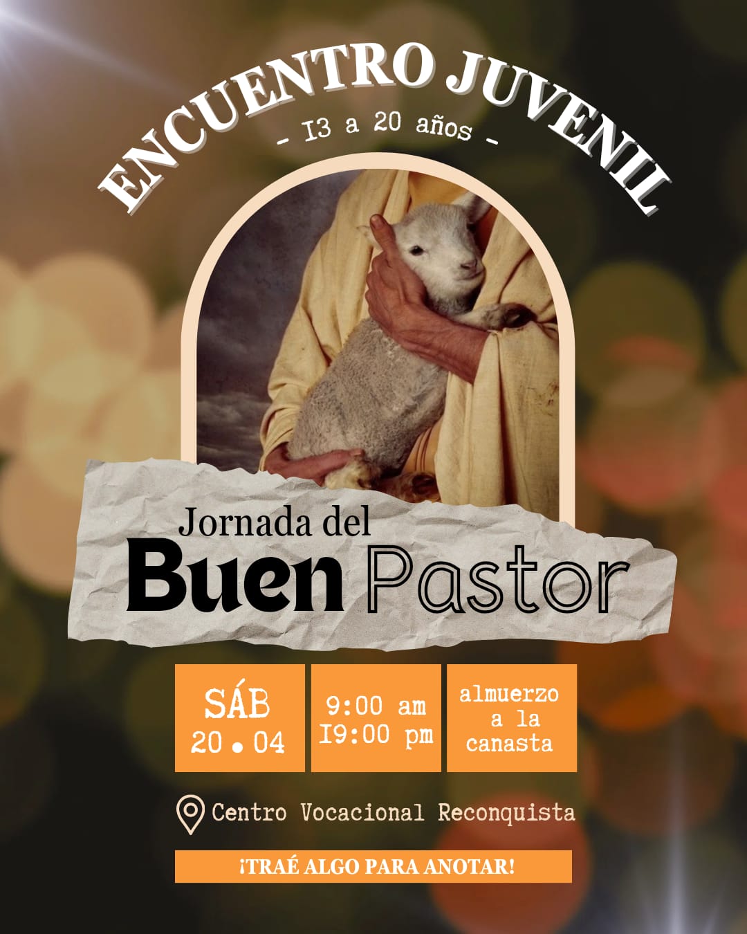 La pastoral vocacional de la Diócesis de Reconquista, invita a todos los interesados a participar de un encuentro juvenil para la Jornada del Buen Pastor, el sábado 20/04 de 09:00 a 19:00 hs. destinado a jóvenes varones y mujeres de entre 13 y 20 años de edad.
