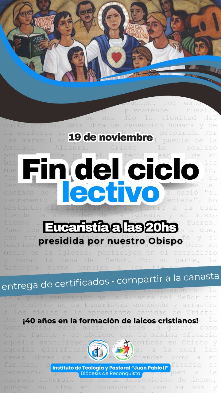 Dando gracias a Dios por estos 40 años al servicio de la formación en nuestra Diócesis de Reconquista, tenemos el agrado de invitarlos a la Eucaristía de fin de ciclo y a la celebración jubilar de nuestro Instituto de Teología y Pastoral «Juan Pablo II».