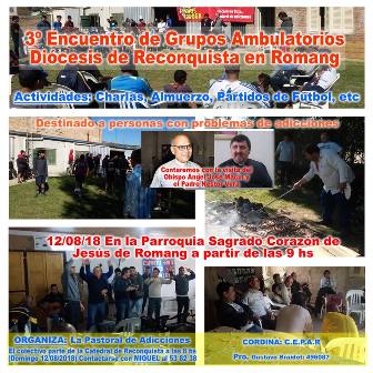 El sábado 12 de agosto, en la Parroquia «Sagrado Corazón de Jesús» de la ciudad de Romang, se estará llevando a cabo el III encuentro de grupos ambulatorios, destinado a personas con problemas de adicciones, el cual está organizado por la pastoral de adicciones diocesana.