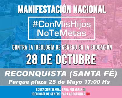En la convocatoria, los organizadores expresan NO querer “que se enseñe ideología de género, en ningún ámbito del gobierno, incluso en las instituciones educativas; que se les quite el derecho a los padres de educar a sus hijos en cuanto a la moral sexual; que se elimine el ‘ideario constitucional’, impidiendo que las escuelas públicas de gestión privada enseñen educación sexual en base a sus idearios; y que se imponga una enseñanza sexual ideológica basada en conceptos culturales y subjetivos, despojándolos de toda argumentación científica”.