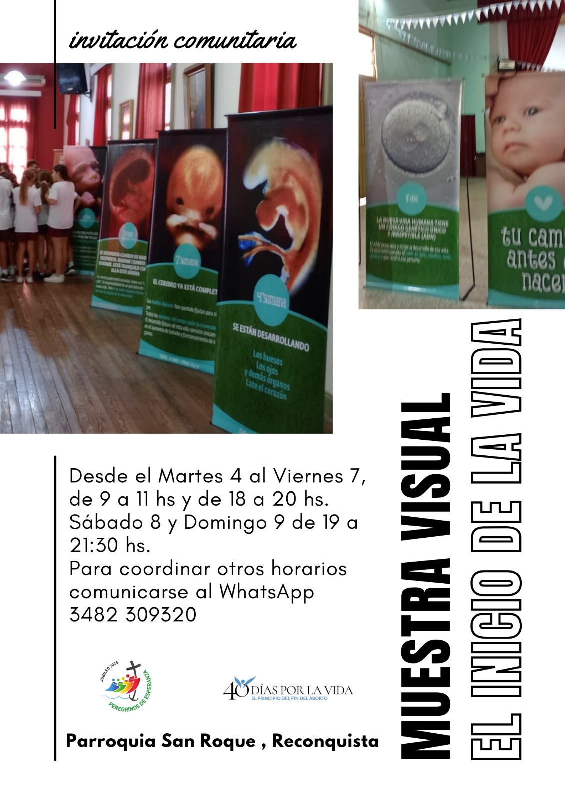 Desde el Obispado de Reconquista, hacemos extensiva la invitación de la Parroquia «San Roque» de la ciudad de Reconquista, a participar de la muestra visual «El Inicio de la Vida», un espacio para profundizar la reflexión en torno al desarrollo gestacional, los derechos del niño, la maternidad y paternidad responsable.