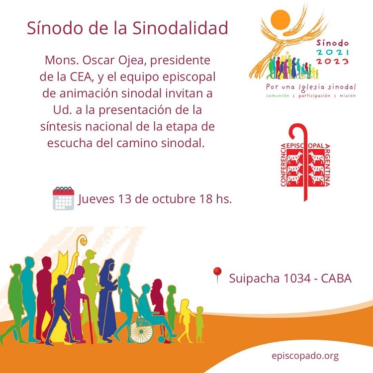 El presidente de la Conferencia Episcopal Argentina, monseñor Oscar Ojea, junto con el equipo episcopal de animación sinodal, el cual integra el obispo diocesano, Mons. Ángel José Macín, y peritos de este equipo, presentarán la síntesis nacional de la etapa de escucha del camino sinodal.