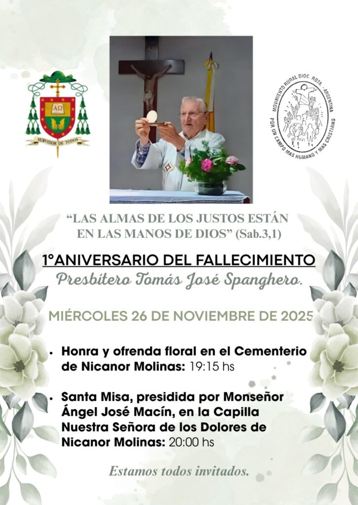 Hoy, 26 de noviembre del 2025, se cumple el primer aniversario de la partida a la casa del Padre del Presbítero Tomás José Spanghero, sacerdote muy querido y recordado de nuestra Diócesis de Reconquista.